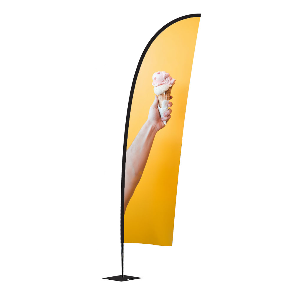 Die Fahne besteht aus 110 g/m² Fahnenstoff mit B1 Zertifizierung bei der das Besatzband als Gummiband in schwarz, weiß oder als bedruckter Stoffsaum erhältlich ist. Die Fahne ist 4/0-farbig, einseitig bedruckbar und kann individuell bedruckt werden.